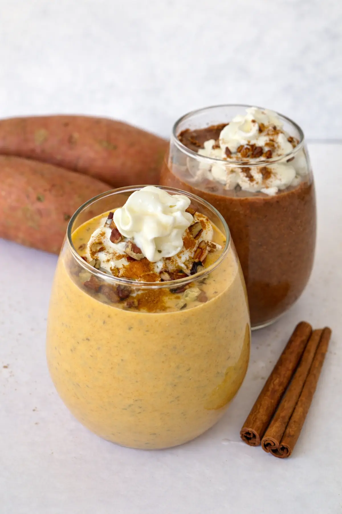 The sweet potatoes make these smoothies thick and creamy while also adding a lot of fiber. The sweet potato pie version is nutty and mild (just like the pie) while the chocolate one tastes rich and delicious. Give them a try and let me know what you think!