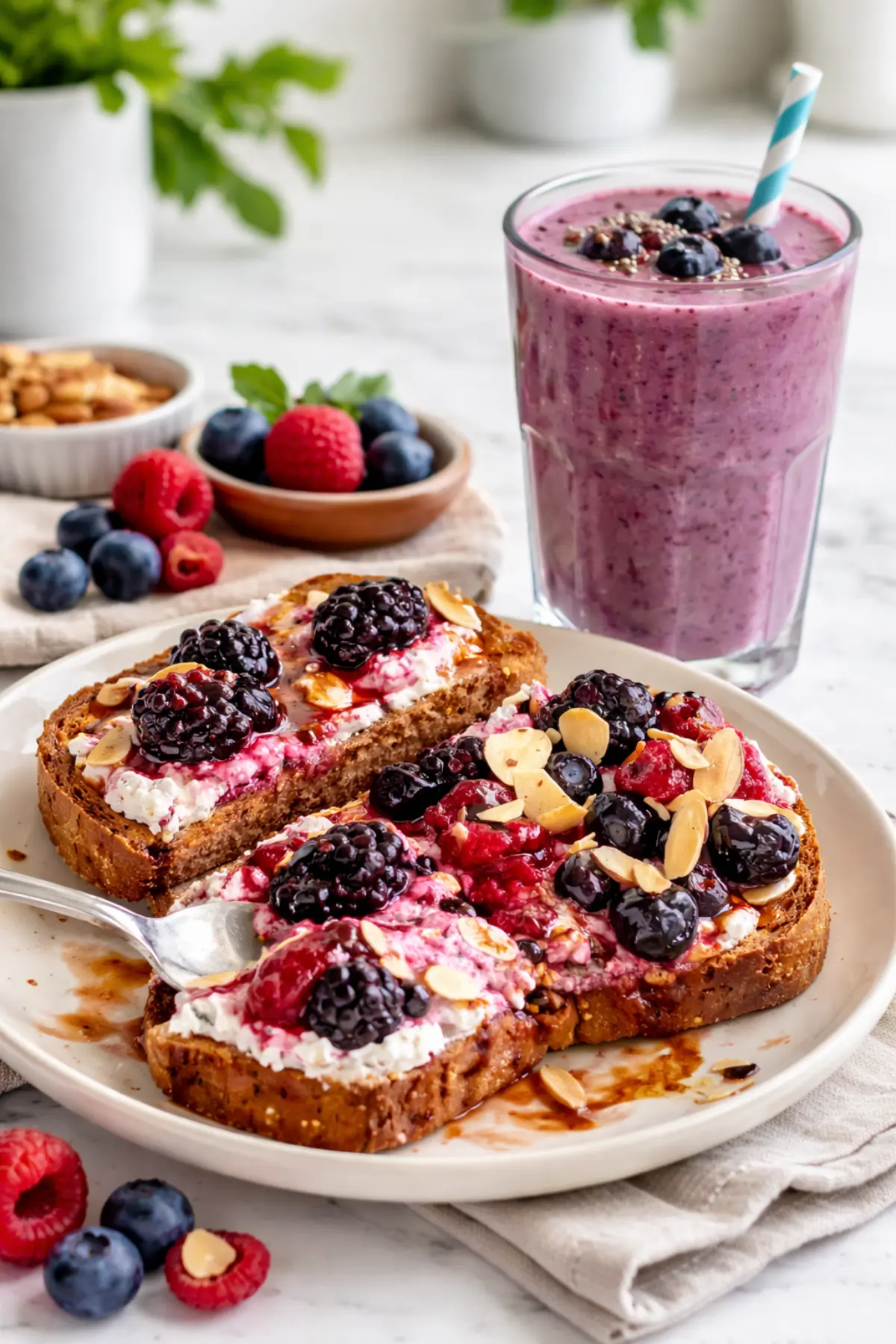 The photo on the left, my whipped cottage cheese balsamic toast, has all of the components of a balanced breakfast: fresh berries, over 20 grams of protein, 10 grams of fiber with complex carbs and some healthy fats if you top with chopped nuts.