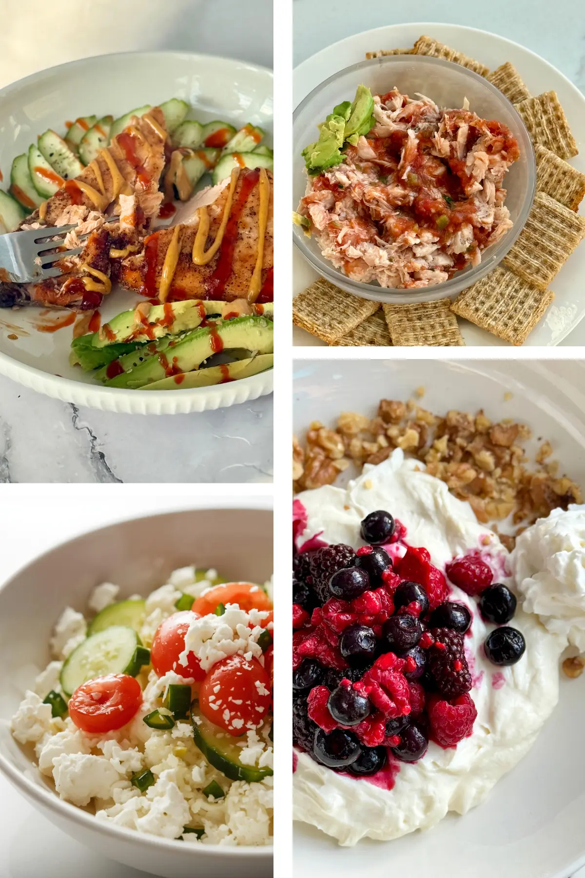 So, here are actual images of simple and low prep lunches that I have been eating lately! Protein plays a huge role in satiety, energy, and blood sugar stability, which is why these work-from-home lunches are built around it.