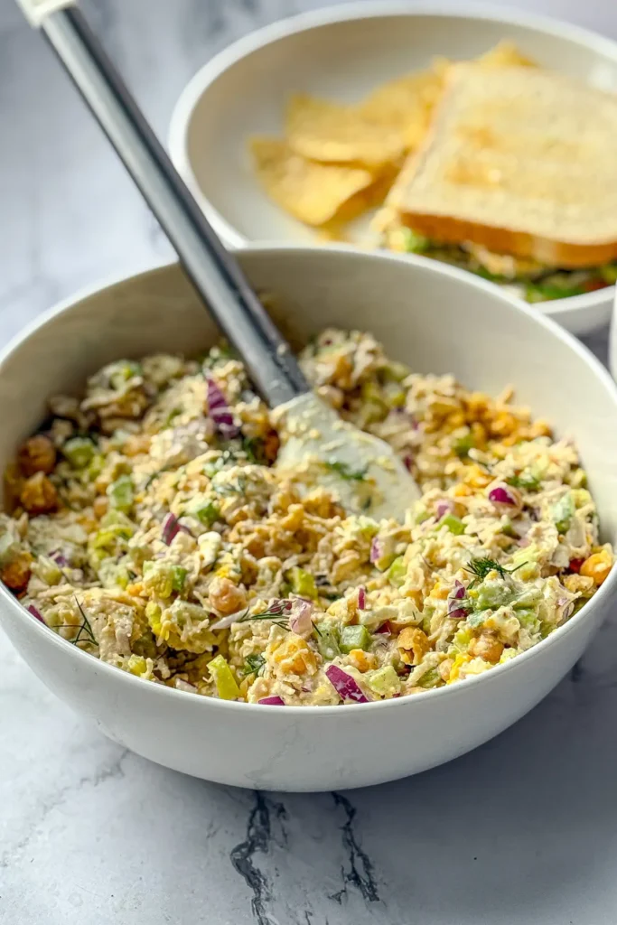 Then, there is the high protein content with that fiber boost from the lightly mashed chickpeas. It gives the salad a creamy, scoopable “chicken salad” texture and you don’t even know they are there.