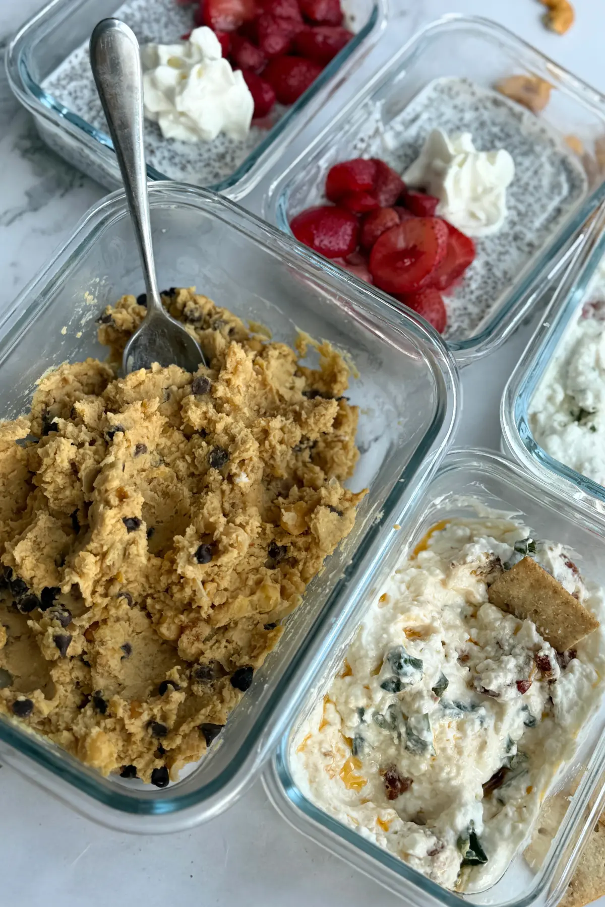 6 cottage cheese dips that come together quickly (you don’t have to make all 6 flavors at once, just picked a couple). This is the ultimate savory snack idea because you can pair the dip with chips, pretzels, or whole wheat crackers yet each serving is lower in calories with 14 grams of protein.